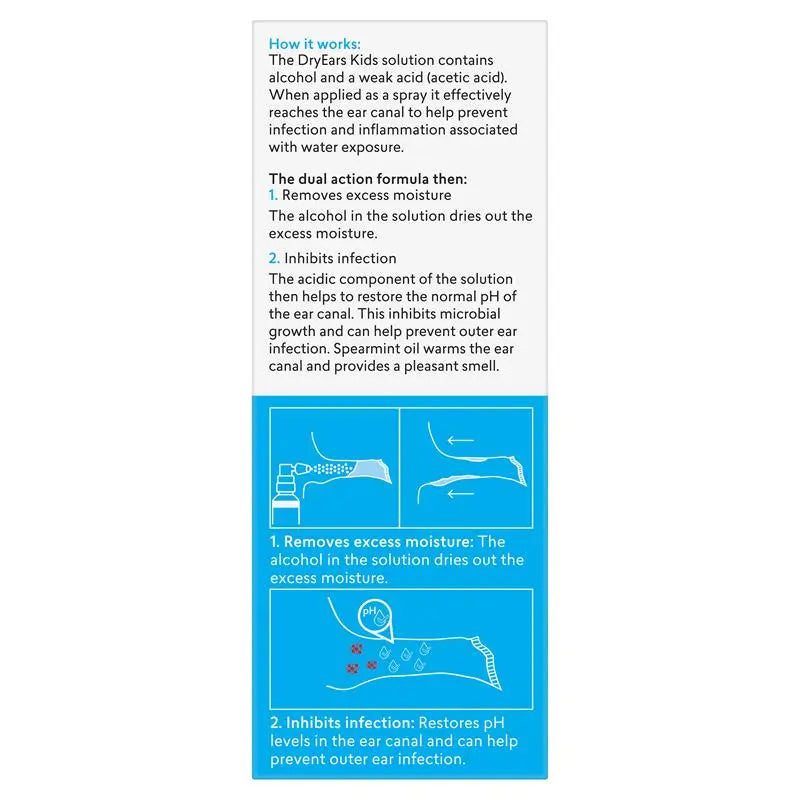 DryEars Kids 噴霧劑是一種有助於預防和治療因接觸水而引起的耳道感染和發炎(例如游泳耳)的溶液。無需滴耳液、歪頭或等待,只需在接觸水後將 DryEars Kids 噴霧劑噴入每隻耳朵即可,以乾燥多餘的水分,恢復耳道的正常 pH 值,並防止任何微生物滋生。