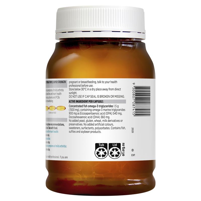 如果您正在尋求緩解發炎和輕度關節炎症狀的幫助,請嘗試 Blackmores Omega Triple Super Strength 魚油膠囊。這款魚油補充劑每粒膠囊提供的 omega-3 含量是我們標準魚油 1000 粒膠囊的三倍*,有助於緩解輕度關節炎的症狀。這種高品質濃縮魚油每粒膠囊含有 900 毫克 omega-3,因此成人每天只需隨餐服用 3 粒膠囊,即可幫助緩解發炎。 Blackmores 魚油是從 100% 野生捕獲的魚中提取的。萃取過程可確保獲得純淨、高品質的油,並經過汞、戴奧辛和多氯聯苯測試。成人:每天服用 1 粒膠囊,作為 omega-3 補充劑並促進心臟健康。 *每粒 Blackmores 標準魚油 1000 粒膠囊含有 300 毫克 omega-3 海洋三酸甘油酯,其中包括 180 毫克二十碳五烯酸 (EPA) 和 120 毫克二十二碳六烯酸 (DHA)。 (總 EPA + DHA= 300 毫克)