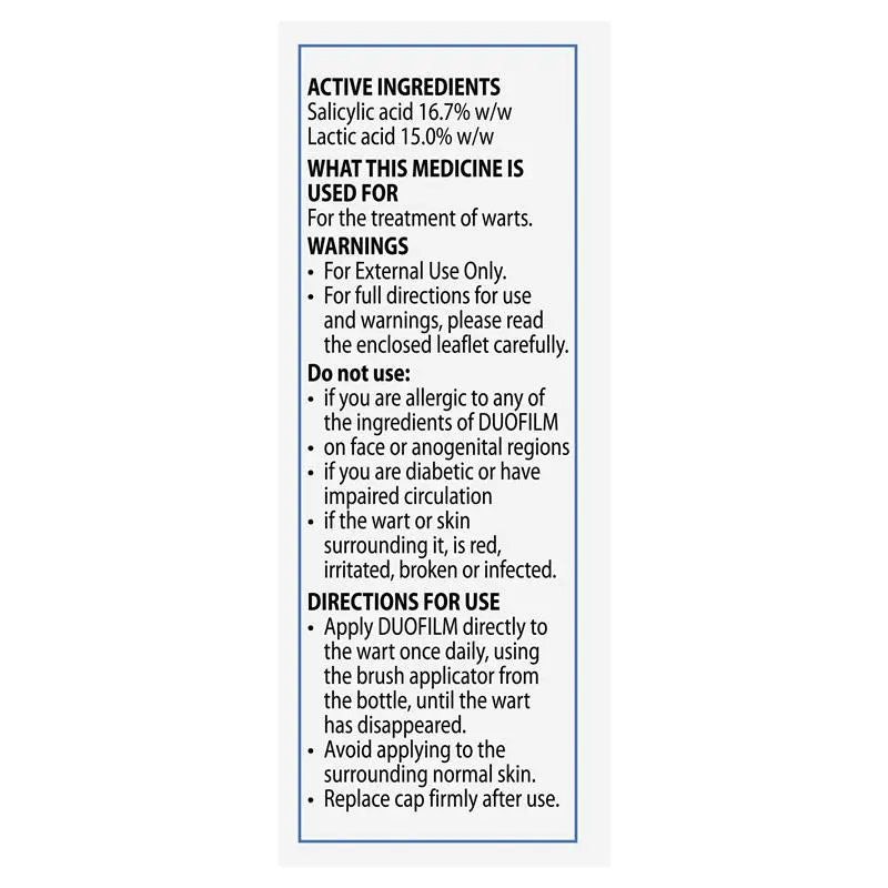 為了有效治療疣,Duofilm 含有兩種具有角質溶解作用的活性成分:水楊酸 (16.7%) 和乳酸 (15%)。