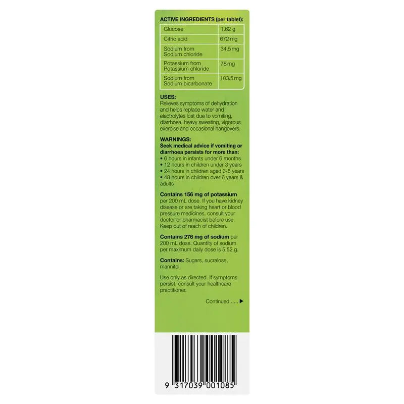 Hydralyte 檸檬青檸泡騰電解質片可緩解脫水症狀,並幫助補充因嘔吐、腹瀉、大量出汗、劇烈運動和偶爾宿醉而流失的水分和電解質。
