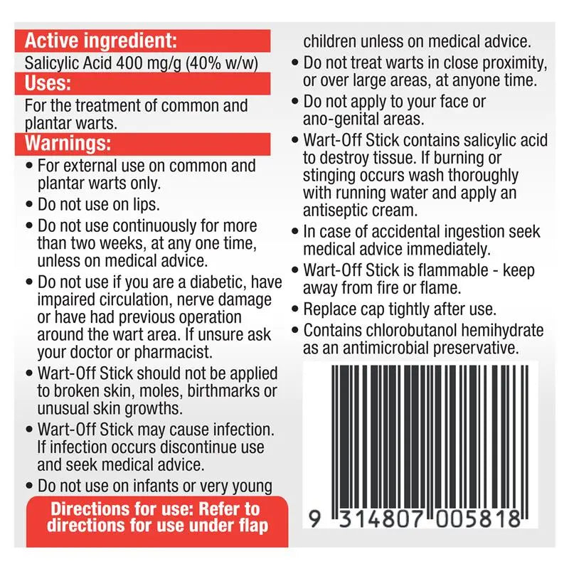 僅限外用,用於尋常疣和蹠疣。請勿用於唇部。未經醫生建議,請勿連續使用超過兩週。如果您患有糖尿病、血液循環障礙、神經損傷或疣體周圍曾接受過手術,請勿使用。如果不確定,請諮詢醫生或藥劑師。 Wart-Off Stick 不應用於破損的皮膚、痣、胎記或異常的皮膚生長。 Wart-Off Stick 可能會引起感染。如果發生感染,請停止使用並就醫。未經醫生建議,請勿用於嬰兒或幼兒。請勿一次在附近或大面積治療疣。請勿用於臉部或肛門生殖器區域。 Wart-Off Stick 含有水楊酸,會破壞組織。如果出現灼熱或刺痛感,請用流水徹底沖洗並塗抹消毒藥膏。若不慎吞食,請立即就醫。 Wart-Off Stick 易燃 - 遠離火源或火焰。使用後請蓋緊瓶蓋。本品含有氯丁醇半水合物作為抗菌防腐劑。