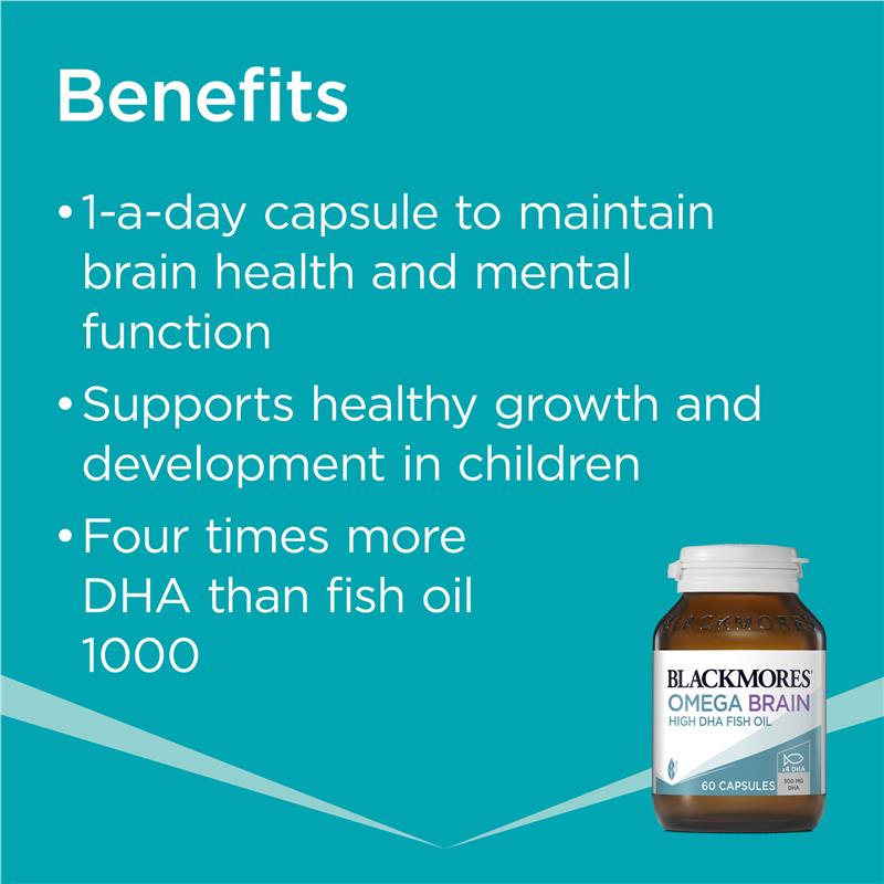 Blackmores Omega Brain 高 DHA 魚油有助於支持認知功能。每個膠囊提供的 DHA 是我們標準魚油 1000 粒膠囊的四倍。萃取過程可確保獲得純淨、高品質的油,並經過汞、戴奧辛和多氯聯苯測試。這種高品質濃縮魚油每粒膠囊提供 500 毫克 DHA,因此每天只需服用 1 粒膠囊,即可幫助支持大腦健康和心理功能。 *每粒Blackmores 標準魚油1000 粒膠囊含有300 毫克omega-3 海洋三酸甘油酯,其中包括180 毫克二十碳五烯酸(EPA) 和120 毫克二十二碳六烯酸(DHA)(EPA + DHA總量= 300 毫克)。