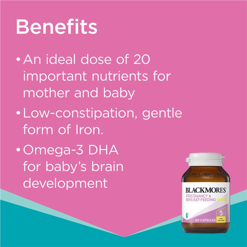 幫助為媽媽和寶寶提供健康懷孕所需的營養。 Blackmores 孕婦和哺乳期黃金膠囊的配方旨在滿足孕婦和哺乳期婦女的營養需求。這款膳食母乳哺育補充品為母親提供 20 種重要營養素,包括葉酸、碘和維生素 D3,並為嬰兒提供支持營養素。它還含有 Omega-3 DHA,可支持寶寶的大腦和神經系統發育,以及對消化系統溫和的低便秘形式的鐵。成人:每日一次,服用兩粒。
