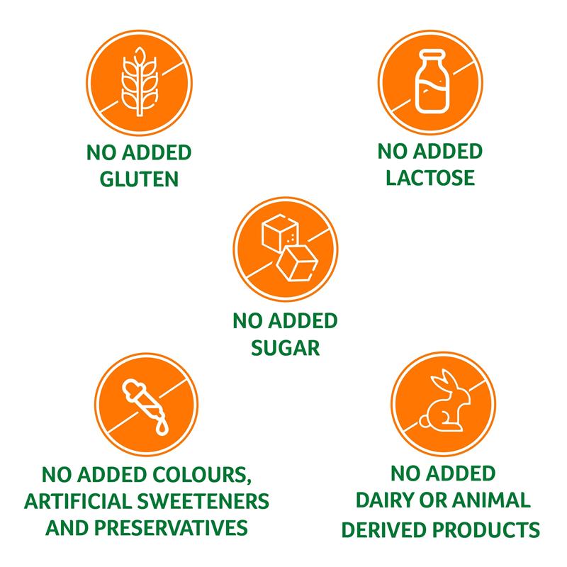 包含:不添加麵筋、乳糖、糖、人造色素、人造甜味劑、人造防腐劑、乳製品或動物衍生產品。
