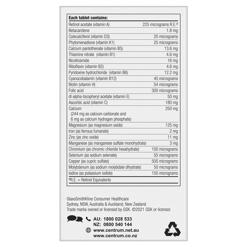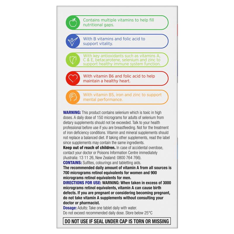 本產品含硒,高劑量時有毒。成人膳食補充劑中硒的每日攝取量不應超過 150 微克。如果您是母乳餵養,請在使用前諮詢您的健康專業人士。不適用於治療缺鐵性疾病。維生素和礦物質補充劑不應取代均衡飲食。如果服用其他補充劑,請閱讀標籤,因為補充劑可能含有相同的成分。請將本品放在兒童不能接觸的地方。如果意外服用過量,請停止使用並立即聯絡您的醫生或毒物資訊中心(澳洲:13 11 26,紐西蘭:0800 764 766)。所有來源的維生素 A 的建議每日攝取量為女性 700 微克視黃醇當量,男性 900 微克視黃醇當量。當維生素 A 攝取量超過 3000 微克視黃醇當量時,可能會導致出生缺陷。如果您懷孕了或正在考慮。懷孕期間,未經諮詢醫生或藥劑師,請勿服用維生素 A 補充劑。原料