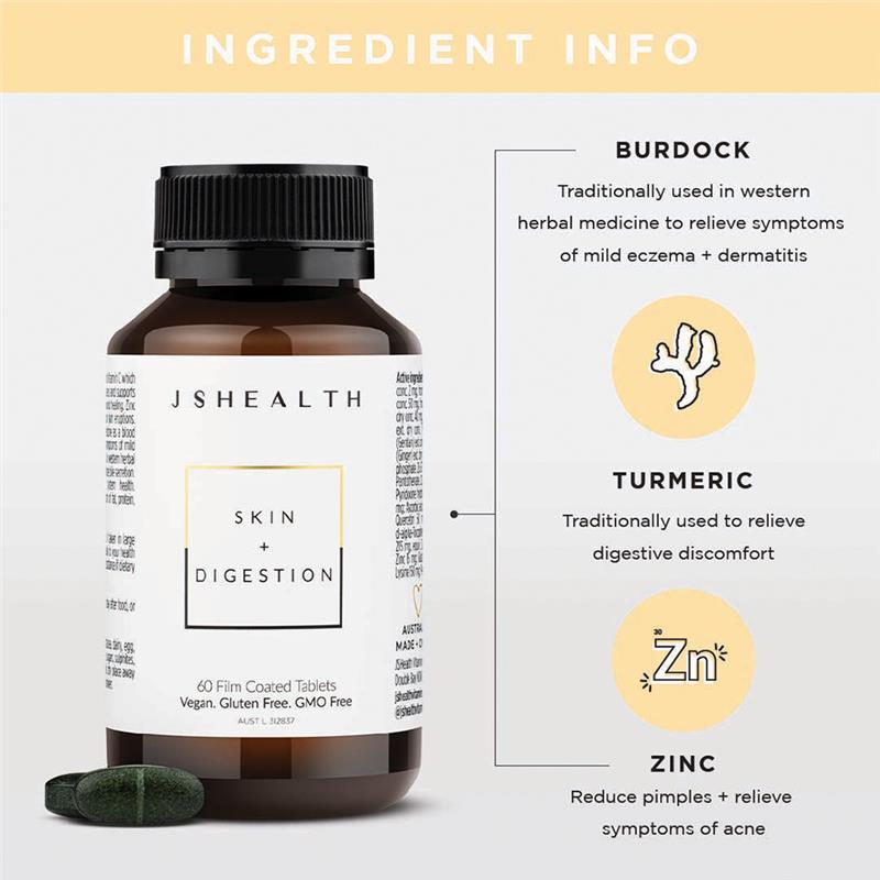包含:JSHealth 皮膚 + 消化配方含有維生素 B2、維生素 C、鋅、牛蒡和薑黃。