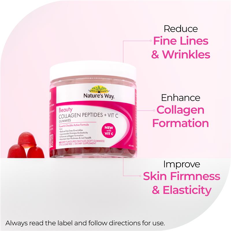 Nature's Way Beauty 膠原蛋白勝肽 + 維生素 C 軟糖具有強大的雙重活性配方,可幫助改善皮膚緊緻度和彈性,從而減少細紋和皺紋。