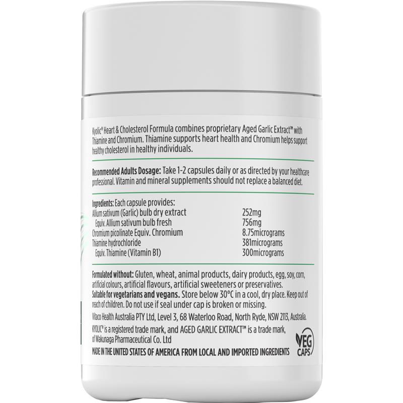 Kyolic® 心臟和膽固醇配方將專有的陳年大蒜萃取物™ 與硫胺素和鉻結合在一起。 Kyolic® 陳蒜萃取™ 是經過長達 20 個月的專有陳化工藝製成的,該工藝將有機種植大蒜中的天然硫化合物轉化為一系列有益的、水溶性的無味化合物。硫胺素(維生素 B1)有益於心臟健康,鉻有助於維持健康個體的健康膽固醇。