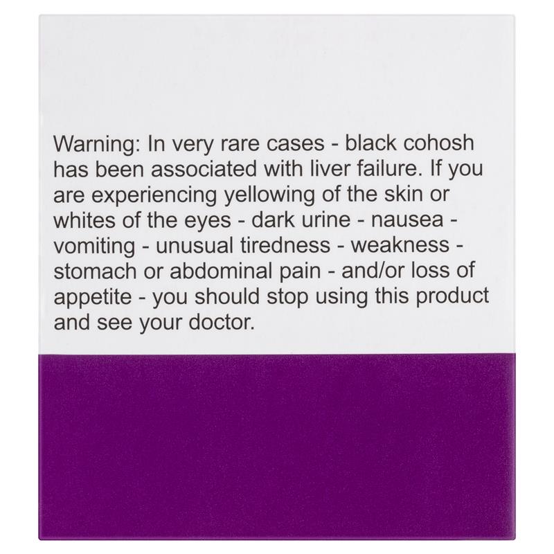 在極少數情況下,黑升麻與肝衰竭有關。如果您有皮膚或眼白髮黃、尿液顏色深、噁心、嘔吐、異常疲倦、虛弱、胃或腹痛和/或食慾不振,您應該停止使用本產品並去看醫生