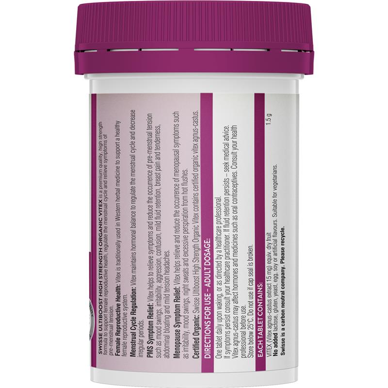 Swisse Ultiboost 高強度有機牡荊是尋求緩解與經前緊張相關的情緒波動的人的選擇。配方提供高強度劑量的牡荊,已知可以調節健康的月經週期並支持健康的女性荷爾蒙平衡。它可以減少與經前緊張有關的情緒波動和乳房脹痛,暫時緩解輕度體液滯留,並減少經前緊張症狀的發生。適合素食主義者,不添加乳糖、麩質或人工香料。