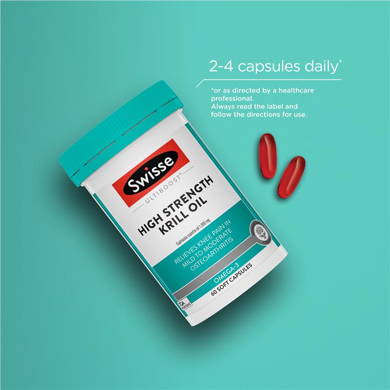 Swisse Ultiboost 高強度磷蝦油含有可持續來源且富含 omega-3 的磷蝦油。它是您緩解輕度至中度骨關節炎引起的膝蓋疼痛和僵硬的盟友,也是您對心臟、大腦和眼睛健康的支持。隨著時間的推移;感受富含 EPA 和 DHA 的磷蝦油的差異。