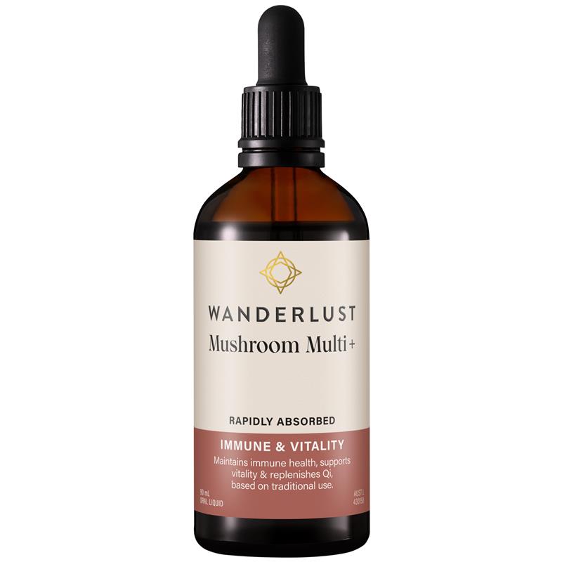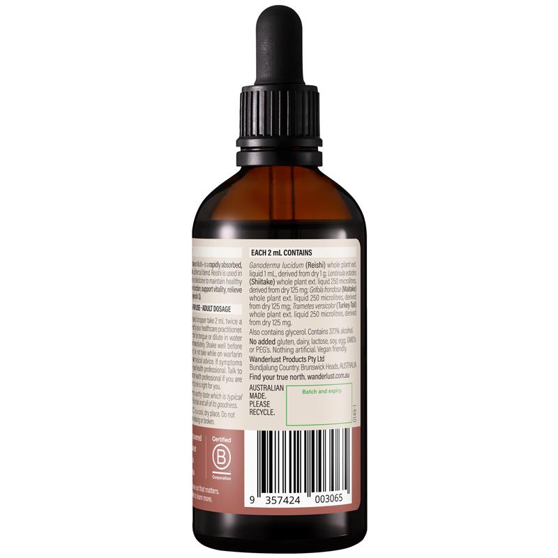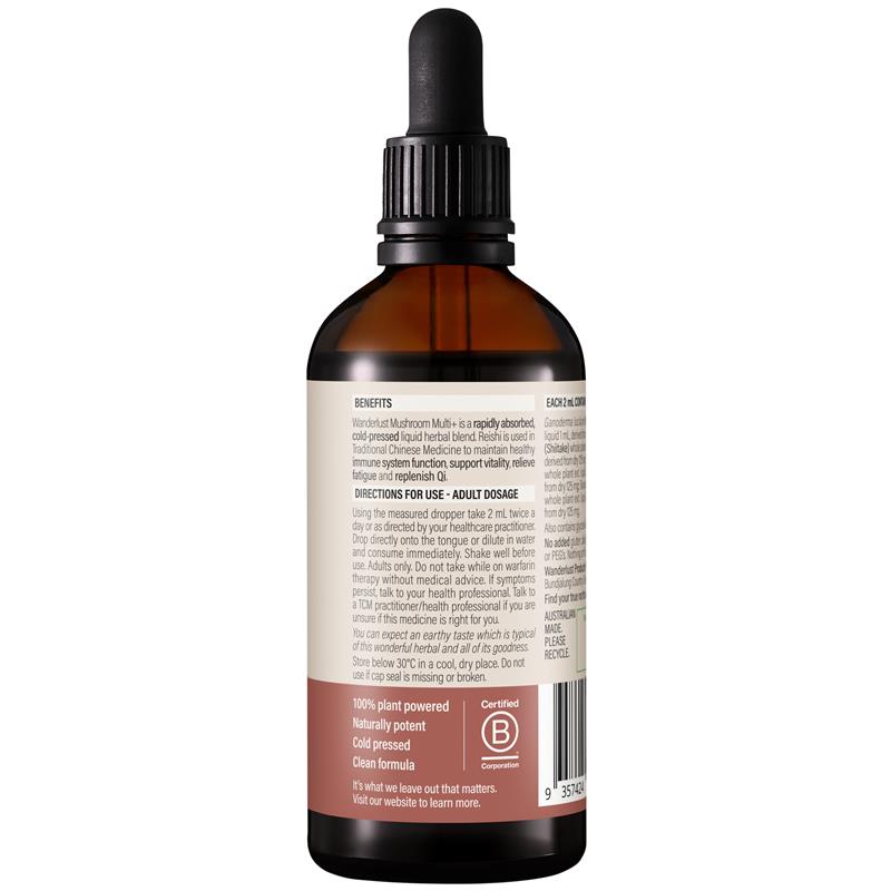 Wanderlust Mushroom Multi+ 是一種快速吸收的冷壓液體草本混合物。靈芝在中醫中用於維持健康的免疫系統功能、支持活力、緩解疲勞和益氣。