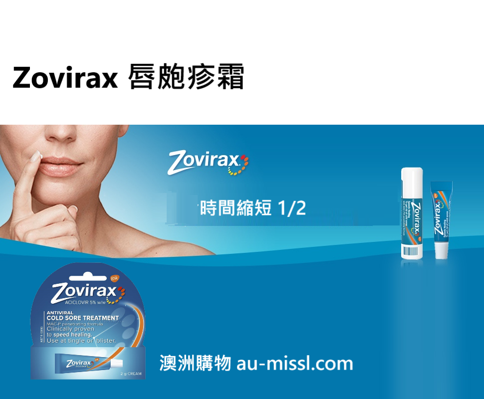 Zovirax 唇皰疹霜將活性成分阿昔洛韋有效深入地輸送到您的皮膚中,以對抗引起唇皰疹的病毒。 Zovirax 唇皰疹霜的設計簡單易用,效果顯著,在第一次感到刺痛時塗抹 Zovirax 唇皰疹霜,即可找到唇皰疹的根源。 Zovirax 感冒瘡膏採用獨特配方,可最大限度地提高滲透力。 Zovirax 唇皰疹霜含有抗病毒劑阿昔洛韋 5%,可阻止唇皰疹病毒的繁殖。 Zovirax MAC-P 滲透配方到達感染部位。使用 Zovirax 感冒瘡膏每天五次,大約每隔四小時一次,持續四天。適用於:唇部和臉部唇皰疹治療。